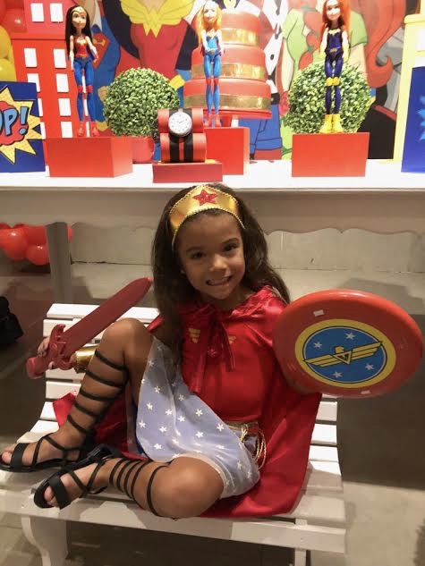 Olha que linda a Manuela em sua festa, amei todos os detalhes!!! A Marisa este ano, vovó da Manuela,  nos pediu uma saia e capa da Mulher Maravilha, para a festa de aniversário de 5 anos, que aconteceu dia 25 em Santos. Nos mostrou uma referência, criamos uma sobreposição de tecido e renda para dar o efeito das estrelas, uma capa vermelha, e ele ficou assim!! Amamos demais!!!